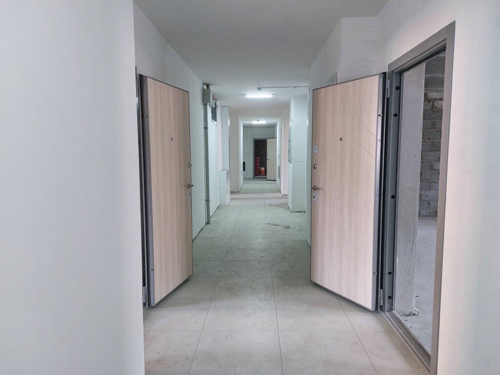 В квартирах выполнены работы по укладке стяжек со звукоизоляцией, а также монтажу входных дверей.