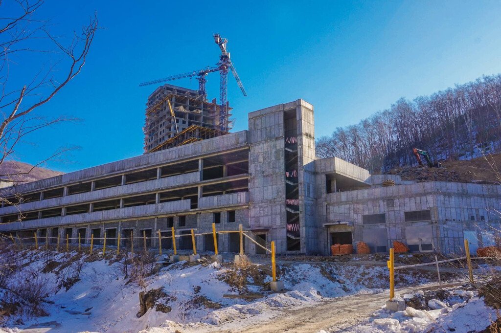Сейчас строители трудятся над каркасом второго и третьего дома, а также непрерывными темпами выполняются работы по возведению наружных стен.