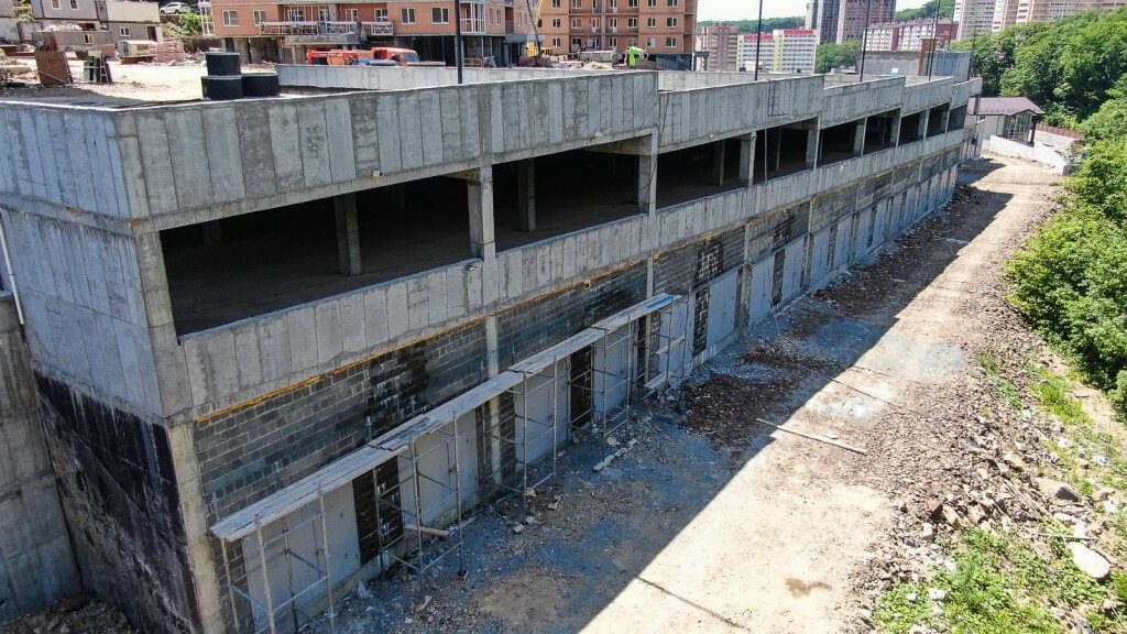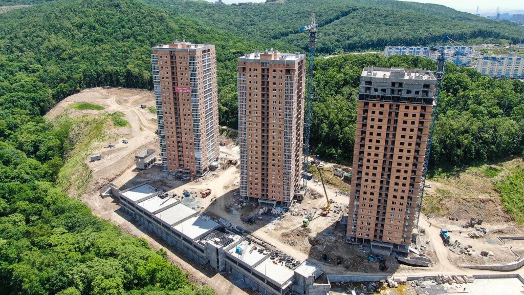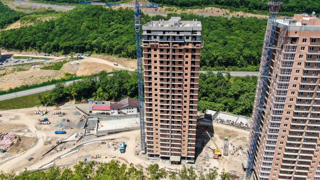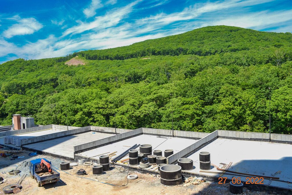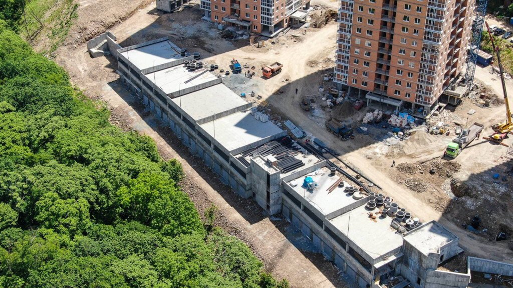 Также работы выполняются на территории жилого комплекса: продолжается прокладка инженерных систем водоснабжения, канализации. А также ведутся работы по обустройству подпорных стен.