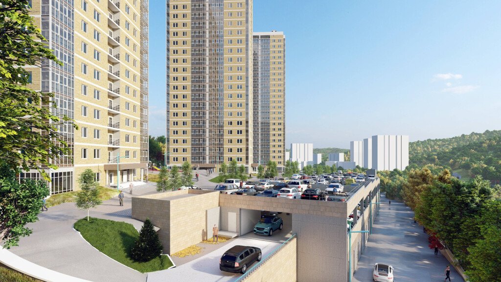 Удобным для будущих жильцов будет и крытый четырёхуровневый паркинг. Он проектируется отдельно стоящим, но благодаря рельефу, на каждый из этажей будет отдельный заезд. На территории рядом с домом будет несколько игровых зон для детей разных возрастов. Позаботились мы и о досуге взрослых: запроектировали несколько площадок для занятия спортом, ворк-аут зоны и места отдыха для всей семьи.
